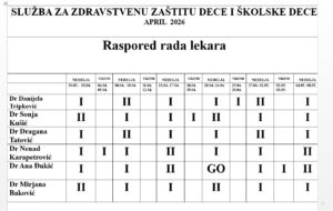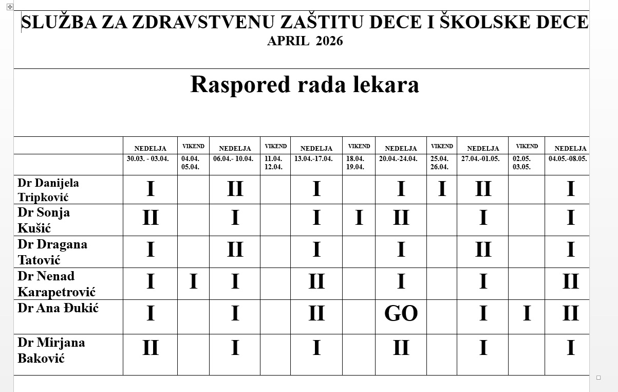 Raspored rada lekera u službi za zdravstvenu zaštitu dece i školske dece za april. October 6, 2025 dzivanjica Aktuelnosti Obaveštavamo Vas da će raspored biti podložan korigovanju o čemu ćete biti blagovremeno obavešteni. Da pogledate raspored rada , potrebno je da kliknete na sliku ispod .